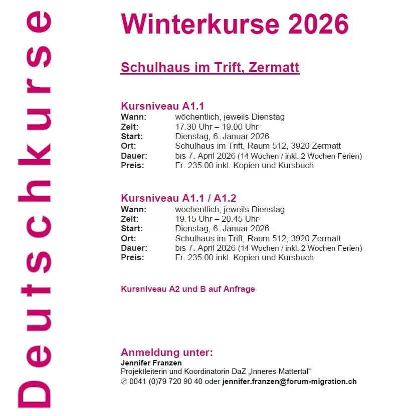 Die Angebote für Deutschkurse in Zermatt ab Januar 2026 sind online!