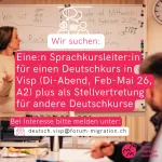 Wir suchen eine:n Deutschlehrer:in in Visp für den Dienstag-Abend-Kurs (Niveau A2, Feb-Mai 2026)