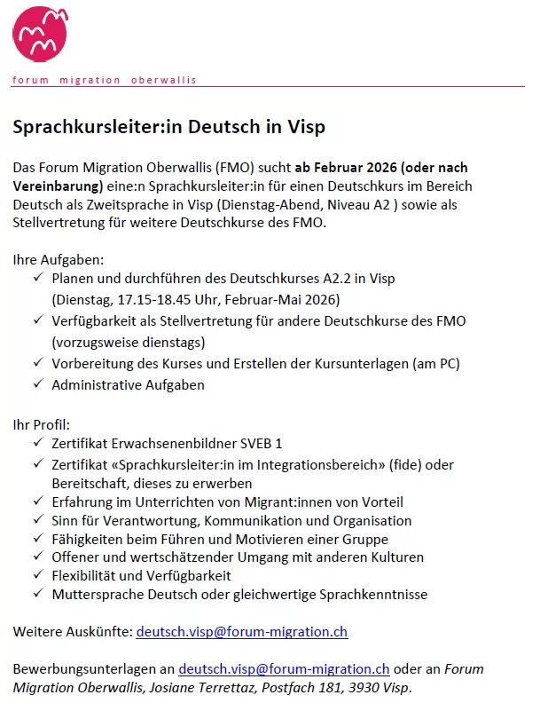 Wir suchen ab Februar 2026 (oder nach Vereinbarung) eine:n Sprachkursleiter:in für einen Deutschkurs im Bereich Deutsch als Zweitsprache in Visp (Dienstag-Abend, Niveau A2 ) sowie als Stellvertretung für weitere Deutschkurse des FMO.