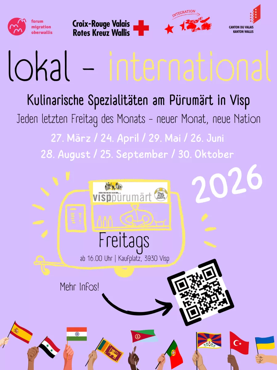 Auch im 2026 gibt es wieder das institutionenübergreifende Projekt "Stand lokal-international am Pürumärt Visp". Für Geflüchtete und Zugewanderte im Oberwallis gibt es auch im 2026 die Möglichkeit, am "Pürumärt Visp" einen Stand zu betreiben.