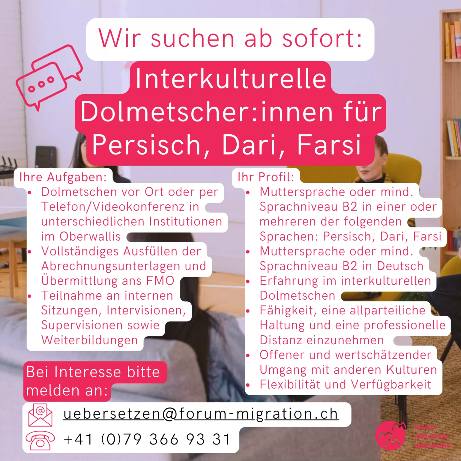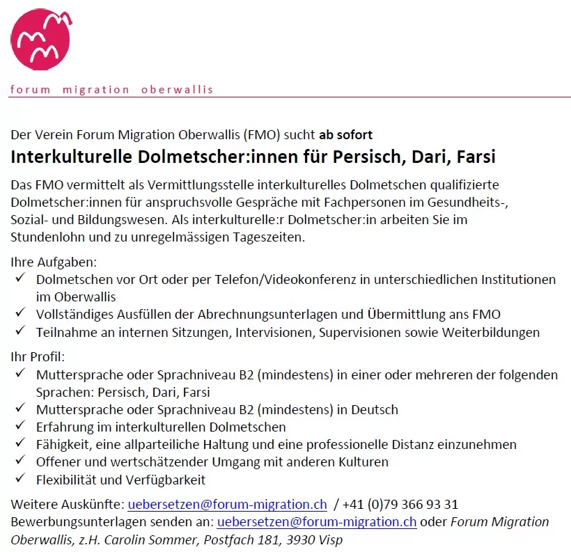 Wir suchen ab sofort oder nach Vereinbarung interkulturelle Dolmetscher:innen für Persisch, Dari, Farsi